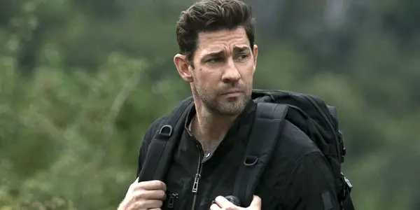 John Krasinski in einer Jack Ryan -Szene mit einem Rucksack draußen und trägt sich ernsthaft