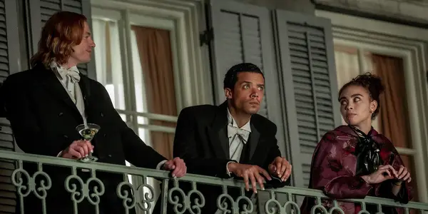 Louis (Jacob Anderson), Lestat (Sam Reid) und Claudia (Bailey Bass) befinden sich in einem Interview mit der ersten Staffel von Vampiren auf ihrem Balkon in New Orleans.
