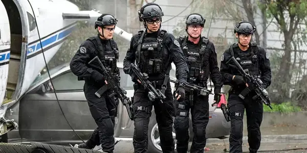 Vier Mitglieder des Hauptoffizier -Teams in seinem Waffenmarkenteam neben einem Flugzeug in der Folge von Swat Diablo